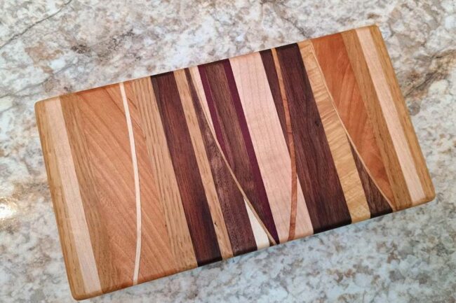 $60.00Cutting Board- Chaos Pattern. Size-5 x 9 x 1. Cherry, walnut, maple, white oak, purple heart. Comes with care instructions and extra bees wax/mineral oil blend paste. Free shipping in continental US.