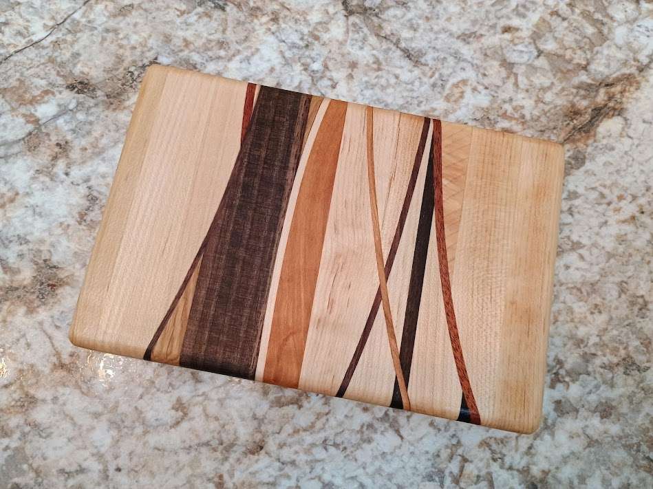 Cutting Board- Chaos Pattern. Size-5 x 7 1/2 x 1. Cherry, walnut, maple, white oak, mahogany. Comes with care instructions and extra bees wax/mineral oil blend paste. Free shipping in continental US.