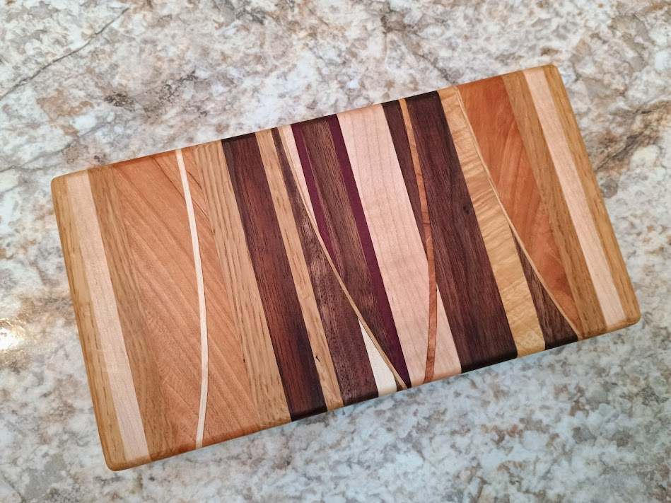 Cutting Board- Chaos Pattern. Size-5 x 9 x 1. Cherry, walnut, maple, white oak, purple heart. Comes with care instructions and extra bees wax/mineral oil blend paste. Free shipping in continental US.