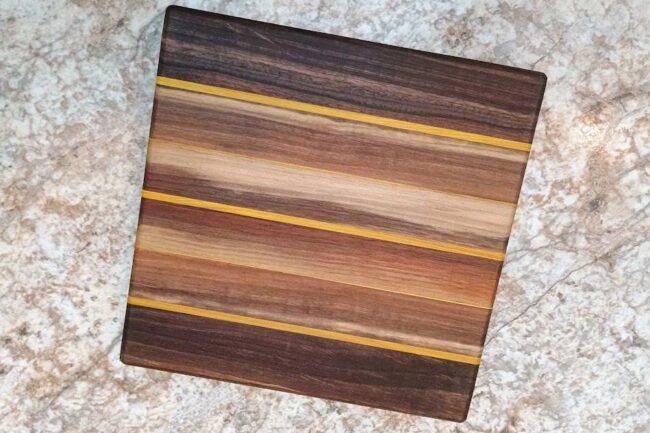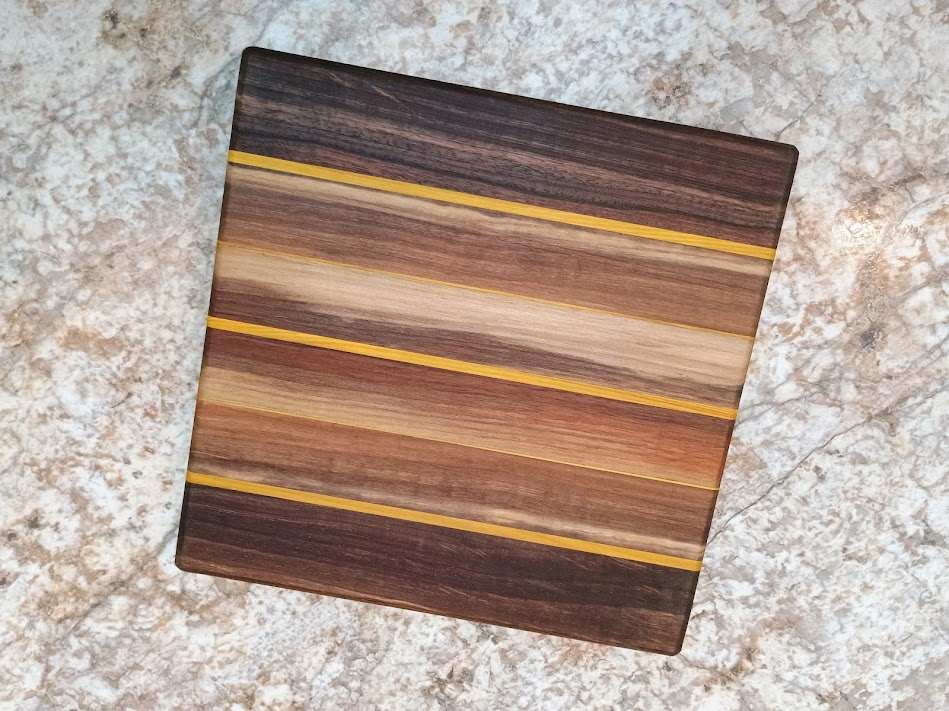 Cutting Board- Edge Grain Pattern- Size-10 1/2 x10 1/2 x 1. Walnut, osage orange. Comes with care instructions and extra bees wax/mineral oil blend paste. Free shipping in continental US.