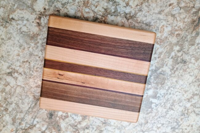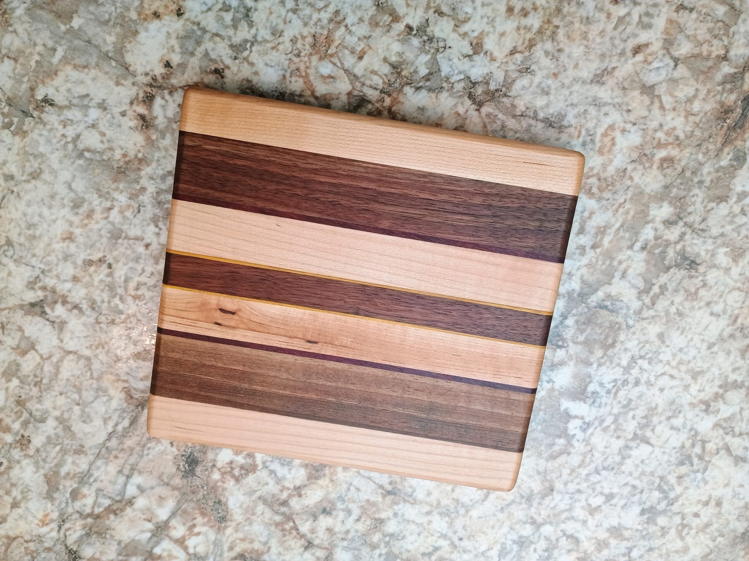 Cutting Board- Edge Grain Pattern- Size-7 1/2 x7 x 1. Walnut, maple, osage orange.Includes care instructions and extra bees wax/mineral oil blend paste. Free shipping in continental US.