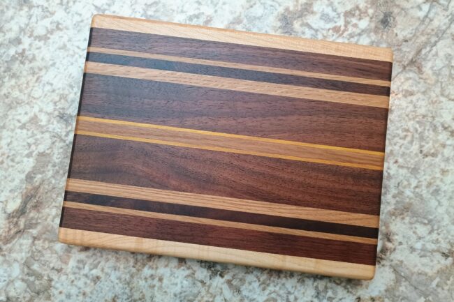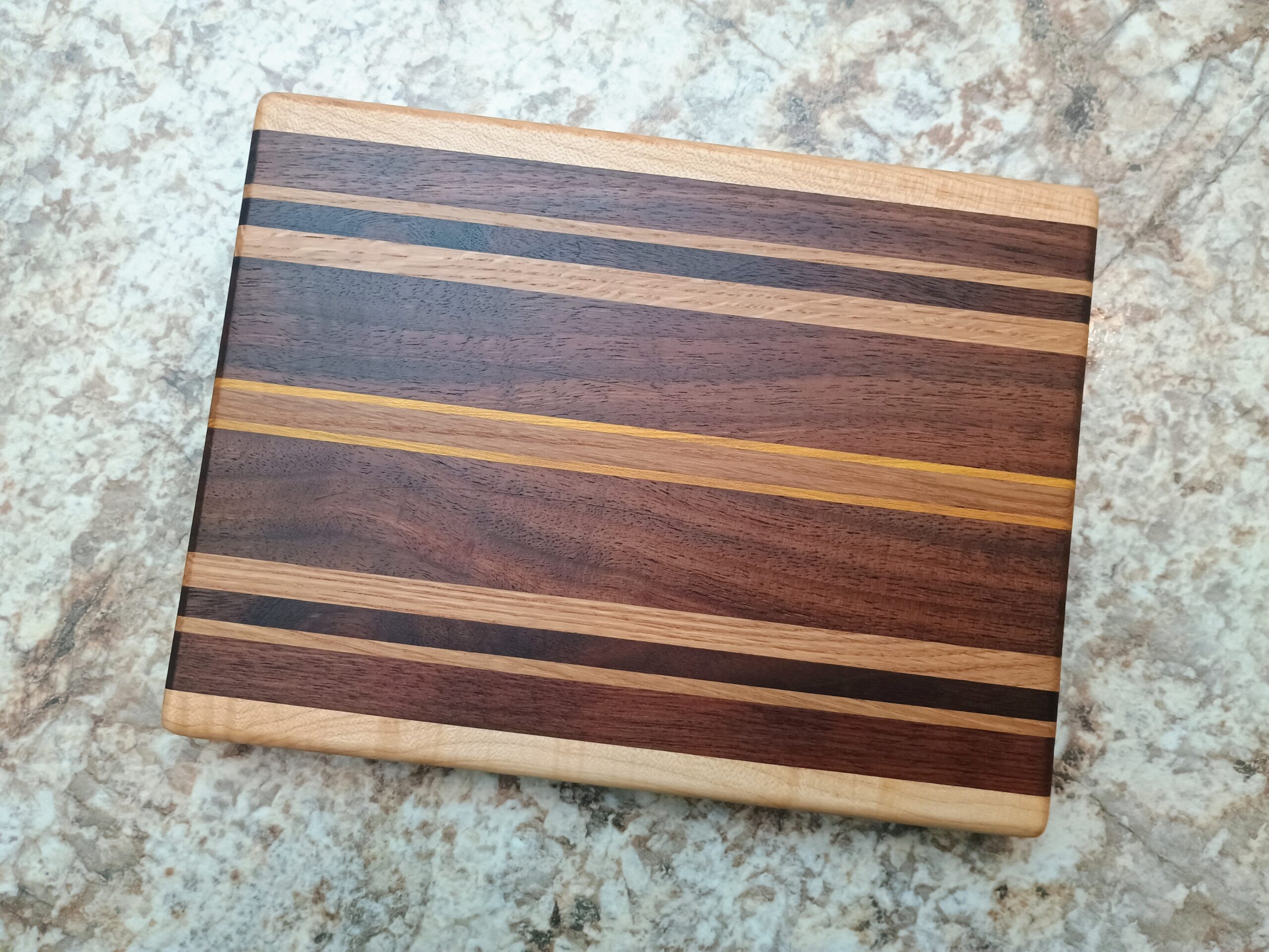 Cutting Board- Edge Grain Pattern- Size-9 1/2 x 7 1/2 x 1. Walnut, osage orange, white oak, maple. Includes care instructions and extra bees wax/mineral oil blend paste. Free shipping in continental US.