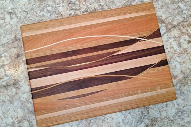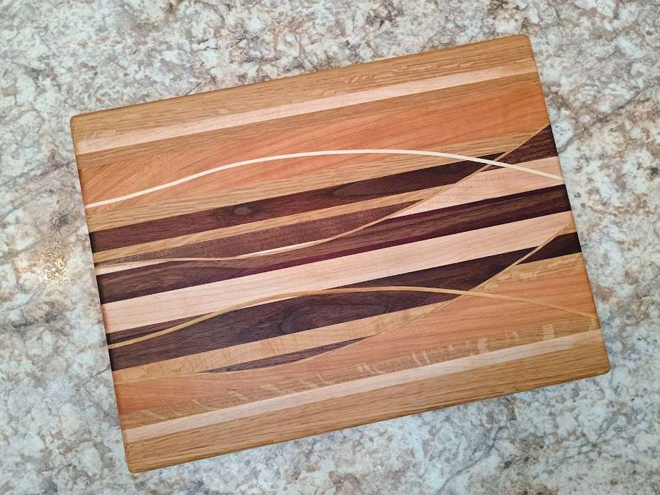 Cutting/Charcuterie Board- Chaos Pattern. Size-10×13.5×1. Cherry, walnut, maple, white oak. Comes with care instructions and extra bees wax/mineral oil blend paste. Free shipping in continental US.