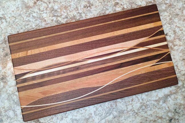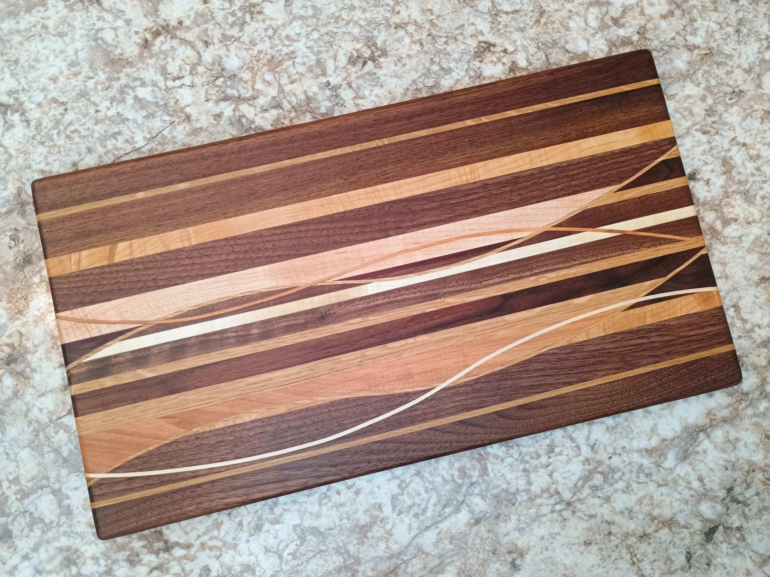 Cutting/Charcuterie Board- Chaos Pattern. Size-10x18x1. Cherry, walnut, maple, white oak. Comes with care instructions and extra bees wax/mineral oil blend paste. Free shipping in continental US.
